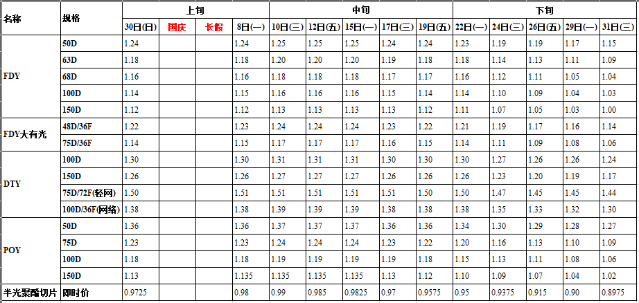 國(guó)慶期間及長(zhǎng)假后,利好因素及節(jié)后采購(gòu)氣氛回升,滌綸長(zhǎng)絲一度交易放量,聚酯廠家報(bào)價(jià)也有上揚(yáng)。但10日夜國(guó)際油價(jià)大跌及PTA期貨大幅下挫,聚合成本出現(xiàn)松動(dòng),下游需求減弱的影響下,滌綸長(zhǎng)絲平淡氣氛凸現(xiàn)。下旬大環(huán)境是全球股市暴跌,原油跌勢(shì)較大,聚酯原料成本面塌陷,滌綸長(zhǎng)絲價(jià)格繼續(xù)下跌,但在月底補(bǔ)倉(cāng)采購(gòu)節(jié)點(diǎn)凸現(xiàn),29-30日也就短暫放量行情,隨后產(chǎn)銷繼續(xù)陷入低迷行情狀態(tài)。10月聚酯工廠滌綸長(zhǎng)絲產(chǎn)銷率平均90%,滌綸長(zhǎng)絲普遍下跌1200-1500元/噸之間,個(gè)別品種甚至出現(xiàn)2000元/噸跌幅。當(dāng)前雖下游加彈、織造開機(jī)率盡力維持,但原油價(jià)格不斷下挫,聚酯成本支撐明顯減弱,同時(shí)聚酯工廠滌綸長(zhǎng)絲庫(kù)存偏高,下游織造采購(gòu)更加趨于謹(jǐn)慎。預(yù)計(jì)11月滌綸長(zhǎng)絲還將有適度回調(diào)行情趨勢(shì)。