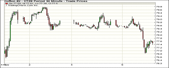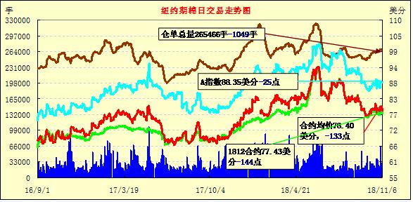 10月6日紐約期棉市場全面收跌。1812合約結(jié)算價77.43美分,跌144點(diǎn);1903合約結(jié)算價79.27美分,跌107點(diǎn);1905合約結(jié)算價80.64美分,跌99點(diǎn)。其他合約下跌42-88點(diǎn)不等。當(dāng)日12月合約小幅高開,因缺乏方向指引,開盤后市場維持震蕩態(tài)勢,后賣盤入場,交易重心承壓走低,至收盤處跌幅加深,最終以大幅下跌收盤。由于市場目前面臨諸多不確定因素,包括結(jié)果即將出爐的美國中期選舉,以及將于本周公布的USDA月度供需平衡表等,使參與者普遍持觀望態(tài)度。另據(jù)悉,某大型多頭基金繼續(xù)12至3月移倉。外圍美元指數(shù)上漲,小麥期貨上漲,玉米和大豆期貨下跌。周二美股全線收漲。