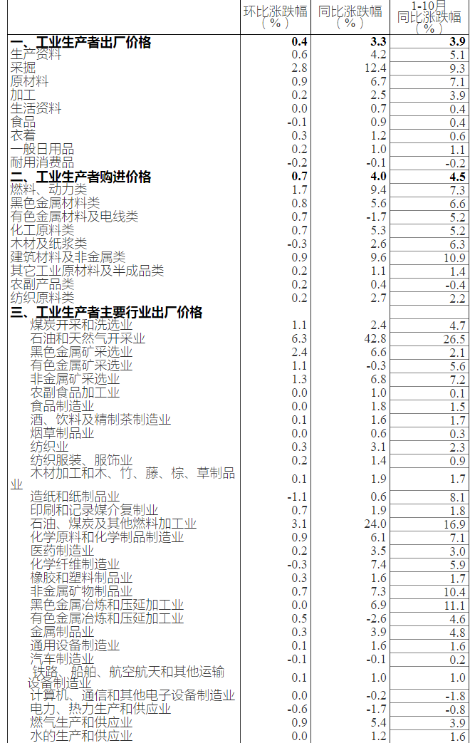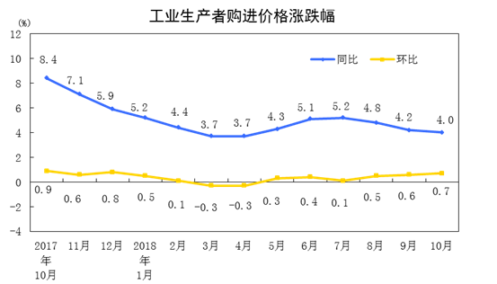11月9日訊 據(jù)國家統(tǒng)計局網(wǎng)站消息,2018年10月份,全國工業(yè)生產(chǎn)者出廠價格同比上漲3.3%,環(huán)比上漲0.4%。工業(yè)生產(chǎn)者購進價格同比上漲4.0%,環(huán)比上漲0.7%。1-10月平均,工業(yè)生產(chǎn)者出廠價格比去年同期上漲3.9%,工業(yè)生產(chǎn)者購進價格上漲4.5%。