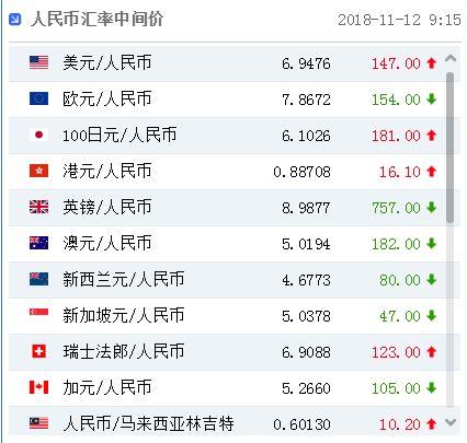 中國人民銀行授權中國外匯交易中心公布,2018年11月12日銀行間外匯市場人民幣匯率中間價為:1美元對人民幣6.9476元,1歐元對人民幣7.8672元,100日元對人民幣6.1026元,1港元對人民幣0.88708元,1英鎊對人民幣8.9877元,1澳大利亞元對人民幣5.0194元,1新西蘭元對人民幣4.6773元,1新加坡元對人民幣5.0378元,1瑞士法郎對人民幣6.9088元,1加拿大元對人民幣5.2660元,人民幣1元對0.60130馬來西亞林吉特,人民幣1元對9.7632俄羅斯盧布,人民幣1元對2.0645南非蘭特,人民幣1元對162.61韓元,人民幣1元對0.52854阿聯(lián)酋迪拉姆,人民幣1元對0.53977沙特里亞爾,人民幣1元對40.8669匈牙利福林,人民幣1元對0.54518波蘭茲羅提,人民幣1元對0.9479丹麥克朗,人民幣1元對1.3067瑞典克朗,人民幣1元對1.2139挪威克朗,人民幣1元對0.78611土耳其里拉,人民幣1元對2.8945墨西哥比索,人民幣1元對4.7551泰銖。