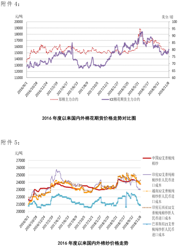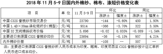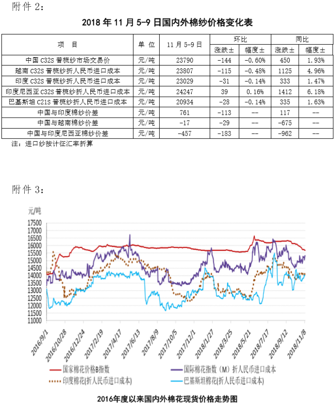 附件2:2018年11月5-9日國內(nèi)外棉紗價格變化表
