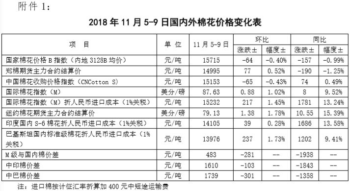 附件1:2018年11月5-9日國內(nèi)外棉花價格變化表