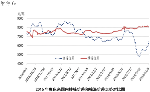 附件6:2016年度以來國內(nèi)紗棉價差和滌棉價差走勢對比圖