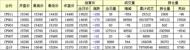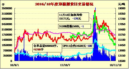 11月12日,隔夜鄭棉沖高下滑,今日早盤探低回升后盤整,日線形成小陰線。日內(nèi)成交量放大,持倉(cāng)量增加。基本面情況:截至2018年11月11日,新疆棉花累計(jì)加工量230.5萬噸,同比減幅5.9%,其中,地方棉花加工量153.8萬噸,同比減幅4.3%,兵團(tuán)棉花加工量76.7萬噸,同比減幅8.9%。當(dāng)日加工量6.2萬噸。