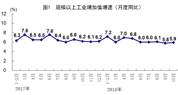 10月份,全國(guó)規(guī)模以上工業(yè)增加值同比實(shí)際增長(zhǎng)5.9%,增速比上月加快0.1個(gè)百分點(diǎn)。分經(jīng)濟(jì)類型看,國(guó)有控股企業(yè)增加值同比增長(zhǎng)4.6%,集體企業(yè)下降3.6%,股份制企業(yè)增長(zhǎng)6.7%,外商及港澳臺(tái)商投資企業(yè)增長(zhǎng)3.9%。分三大門類看,采礦業(yè)增加值同比增長(zhǎng)3.8%;制造業(yè)增長(zhǎng)6.1%,比上月加快0.4個(gè)百分點(diǎn);電力、熱力、燃?xì)饧八a(chǎn)和供應(yīng)業(yè)增長(zhǎng)6.8%。1-10月份,全國(guó)規(guī)模以上工業(yè)增加值同比增長(zhǎng)6.4%。1-9月份,全國(guó)規(guī)模以上工業(yè)企業(yè)實(shí)現(xiàn)利潤(rùn)總額49713億元,同比增長(zhǎng)14.7%;主營(yíng)業(yè)務(wù)收入利潤(rùn)率為6.44%,比上年同期提高0.29個(gè)百分點(diǎn)。