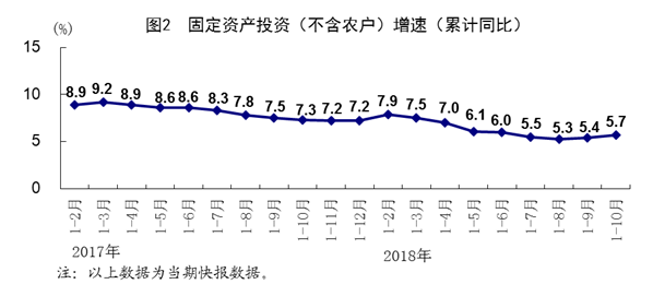 1-10月份,全國(guó)固定資產(chǎn)投資(不含農(nóng)戶)547567億元,同比增長(zhǎng)5.7%,增速比1-9月份加快0.3個(gè)百分點(diǎn)。其中,民間投資341343億元,增長(zhǎng)8.8%,加快0.1個(gè)百分點(diǎn)。分產(chǎn)業(yè)看,第一產(chǎn)業(yè)投資同比增長(zhǎng)13.4%;第二產(chǎn)業(yè)投資增長(zhǎng)5.8%,其中制造業(yè)投資增長(zhǎng)9.1%,加快0.4個(gè)百分點(diǎn);第三產(chǎn)業(yè)投資增長(zhǎng)5.4%,其中基礎(chǔ)設(shè)施投資增長(zhǎng)3.7%,加快0.4個(gè)百分點(diǎn)。高技術(shù)制造業(yè)、裝備制造業(yè)投資同比分別增長(zhǎng)16.1%和11.1%,增速均加快1.2個(gè)百分點(diǎn),分別比全部投資快10.4和5.4個(gè)百分點(diǎn)。1-10月份,全國(guó)房地產(chǎn)開發(fā)投資99325億元,同比增長(zhǎng)9.7%。全國(guó)商品房銷售面積133117萬平方米,增長(zhǎng)2.2%;全國(guó)商品房銷售額115914億元,增長(zhǎng)12.5%。