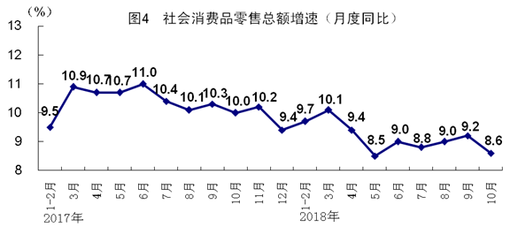 10月份,受中秋假日錯(cuò)月以及“雙十一”電商節(jié)前部分商品消費(fèi)延遲等因素影響,社會(huì)消費(fèi)品零售總額35534億元,同比增長(zhǎng)8.6%,增速比上月回落0.6個(gè)百分點(diǎn)。按經(jīng)營(yíng)單位所在地分,城鎮(zhèn)消費(fèi)品零售額30601億元,同比增長(zhǎng)8.4%;鄉(xiāng)村消費(fèi)品零售額4934億元,增長(zhǎng)9.7%。按消費(fèi)類型分,餐飲收入4006億元,增長(zhǎng)8.8%;商品零售31528億元,增長(zhǎng)8.5%。1-10月份,社會(huì)消費(fèi)品零售總額同比增長(zhǎng)9.2%。升級(jí)類商品銷售增長(zhǎng)較快。1-10月份,限額以上單位商品零售額中,化妝品類、通訊器材類商品零售額同比分別增長(zhǎng)11.4%和10.4%,增速分別比社會(huì)消費(fèi)品零售總額快2.2和1.2個(gè)百分點(diǎn)。