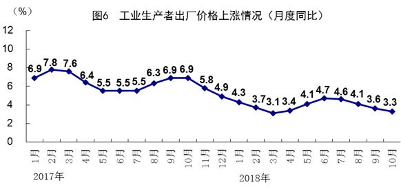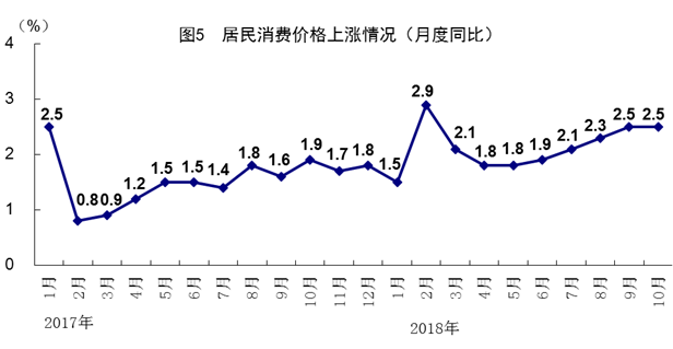 10月份,全國(guó)居民消費(fèi)價(jià)格同比上漲2.5%,漲幅與上月持平,環(huán)比上漲0.2%。分類別看,食品煙酒價(jià)格同比上漲2.9%,衣著上漲1.4%,居住上漲2.5%,生活用品及服務(wù)上漲1.5%,交通和通信上漲3.2%,教育文化和娛樂上漲2.5%,醫(yī)療保健上漲2.6%,其他用品和服務(wù)上漲1.3%。1-10月份,全國(guó)居民消費(fèi)價(jià)格同比上漲2.1%。10月份,全國(guó)工業(yè)生產(chǎn)者出廠價(jià)格同比上漲3.3%,漲幅比上月回落0.3個(gè)百分點(diǎn),環(huán)比上漲0.4%;工業(yè)生產(chǎn)者購(gòu)進(jìn)價(jià)格同比上漲4.0%,環(huán)比上漲0.7%。1-10月份,全國(guó)工業(yè)生產(chǎn)者出廠價(jià)格同比上漲3.9%,工業(yè)生產(chǎn)者購(gòu)進(jìn)價(jià)格同比上漲4.5%。