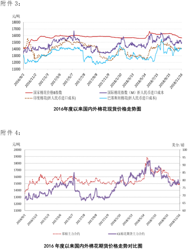本周,國際油價帶動美國股市和商品期貨全面下跌,拖累國際棉價下跌。2018年11月12-16日,紐約棉花期貨主力合約結算價78.14美分/磅,較上周下跌1美分/磅,跌幅1.26%;代表進口棉中國主港到岸均價的國際棉花指數(shù)(M)為85.96美分/磅,較上周下跌1.67美分/磅,跌幅1.91%,折人民幣進口成本14949元/噸,較上周下跌283元/噸,跌幅1.86%。內(nèi)外棉價差730元/噸,較上周擴大247元/噸。(詳見附件1)