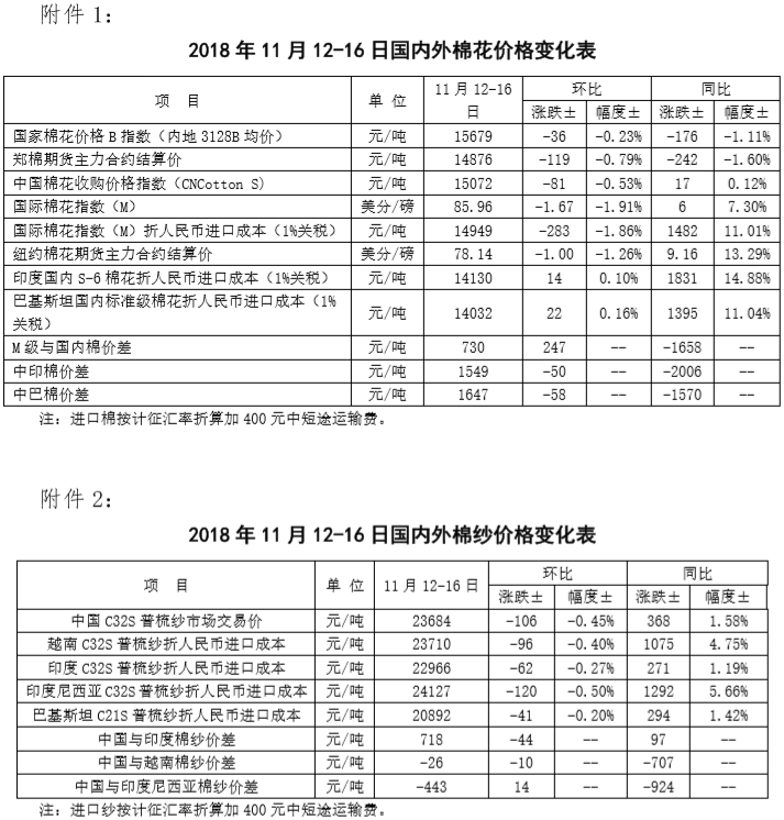 附件1:2018年11月12-16日國內(nèi)外棉花價格變化表