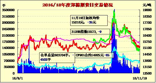 11月19日,隔夜鄭棉下試回升,今日早盤受外盤沖高乏力的影響放量回落,午后減倉收低,日線形成小陰線。日內(nèi)成交量萎縮,持倉量近減遠(yuǎn)增?;久媲闆r:2018年11月12日-11月18日,據(jù)全國棉花交易市場庫對庫新疆核查點(diǎn)統(tǒng)計(jì),公路出疆棉運(yùn)輸量總計(jì)2.61萬噸,較前一周運(yùn)輸量增加0.09萬噸,同比減少2.0萬噸。期間公路運(yùn)輸量略有回升,周內(nèi)運(yùn)價穩(wěn)中有漲,部分路線運(yùn)價小幅上漲??瓦\(yùn)至河南省平均運(yùn)價約764元/噸,較前一周運(yùn)價基本持平;奎屯運(yùn)至山東省平均運(yùn)價約815元/噸,較前一周運(yùn)價上漲26元/噸;庫爾勒運(yùn)至河南省平均運(yùn)價約771元/噸,較前一周運(yùn)價上漲42元/噸,庫爾勒運(yùn)至山東省平均運(yùn)價約791元/噸,較前一周運(yùn)價上漲14元/噸。