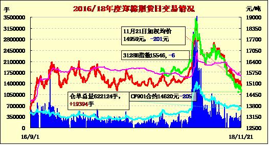 11月21日,隔夜鄭棉下跌,今日早盤(pán)放量滑后在逢低買(mǎi)盤(pán)推動(dòng)下回升,尾盤(pán)受空頭回補(bǔ)推動(dòng)收強(qiáng),日線(xiàn)形成長(zhǎng)下影線(xiàn)的陰線(xiàn)星。日內(nèi)成交量放大,持倉(cāng)量增加?;久媲闆r:今年9月印度棉花出口16384噸,主要至孟加拉(10992噸),越南(2283噸)和印尼(1488噸)。今年8-9月印度累計(jì)出口棉花49038噸,較去年同期增加75%。同時(shí),當(dāng)月印度棉花進(jìn)口22816噸,其中主要是美棉和澳棉,今年8-9月印度累計(jì)進(jìn)口棉花48868噸,去年同期為14.53萬(wàn)噸。