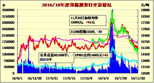 11月22日,隔夜鄭棉平開回落,今日早盤探低回升后盤整,尾盤收低,日線形成陰線。日內(nèi)成交量萎縮,持倉量近減遠(yuǎn)增?;久媲闆r:周三德克薩斯西部到中部地區(qū)采摘順利進(jìn)行,白天氣溫在50到70華氏度,夜間溫度在30到40華氏度,預(yù)計(jì)未來7天內(nèi)將不會(huì)降雨。當(dāng)?shù)剀埢◤S忙于加工,全天候開機(jī)工作。此外,德克薩斯南部部分地區(qū)被多云天氣籠罩,預(yù)計(jì)周四將有40%-70%的概率降雨,但當(dāng)?shù)夭烧呀咏瓿桑蟛糠值貐^(qū)已為過冬做好了準(zhǔn)備,因此水分將受到歡迎。