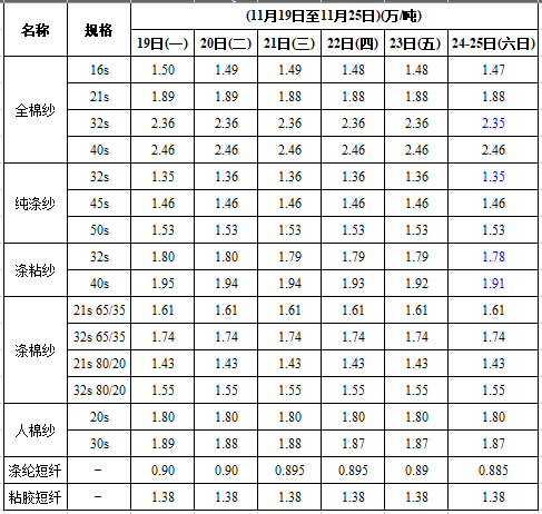 本周(11月19-25日),個別全棉紗報價呈穩(wěn)中微跌狀態(tài),且成交狀況一般,全棉紗32S、J40S銷量較好,其它銷售一般,但全棉/氨綸包芯紗(21S+40D)和(32S+40D)成交略有上升,主要是彈力棉布面料銷售尚好拉動。滌粘紗40S/2交易量有升,滌粘紗價格維持穩(wěn)中偏弱狀態(tài)。滌棉紗90/10、80/20行情穩(wěn)定。個別純滌紗價格行情呈盤跌態(tài)勢,目前32S、45S銷量好于其他,滌綸短纖價格走勢震蕩盤跌,1.4D×38mm中心價落在8850-8890元/噸之間。人棉紗行情一般,10S成交較多,個別價格行情呈下滑態(tài)勢,粘膠短纖價格調(diào)整之中,中心價13800元/噸左右。預計下周人棉紗行情還將有調(diào)整行情趨勢。