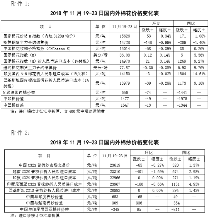 附件1:2018年11月19-23日國內(nèi)外棉花價格變化表