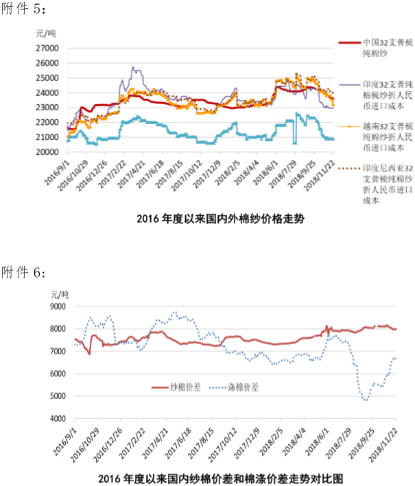 附件5:2016年度以來國內(nèi)外棉紗價格走勢圖