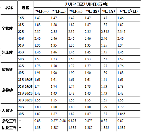 一周來(lái)(11月26日至12月2日),全棉紗價(jià)格持續(xù)下調(diào),J21S、32S動(dòng)銷,全棉/氨綸包覆紗(21S+40D)和(32S+40D)成交略有回升,主要是彈力棉布類面料銷售仍有動(dòng)量。滌棉紗價(jià)格行情呈偏弱調(diào)整態(tài)勢(shì)。滌粘紗行情呈均有小幅度下跌,滌粘紗40S/2交易量有升。純滌紗價(jià)格呈現(xiàn)弱勢(shì)下滑狀態(tài),銷售一般,相比之下45S較順暢,上游原料滌綸短纖價(jià)格有所下調(diào),1.4D×38mm中心價(jià)落在8700元/噸左右。人棉紗價(jià)格穩(wěn)中有落,相比之下10S動(dòng)銷量,主要下游織造用于生產(chǎn)錦綸人棉羅緞面料,粘膠短纖價(jià)格震蕩偏堅(jiān)挺調(diào)整,均價(jià)13850元/噸左右,預(yù)計(jì)下周人棉紗行情還將有適度調(diào)整趨勢(shì)。
