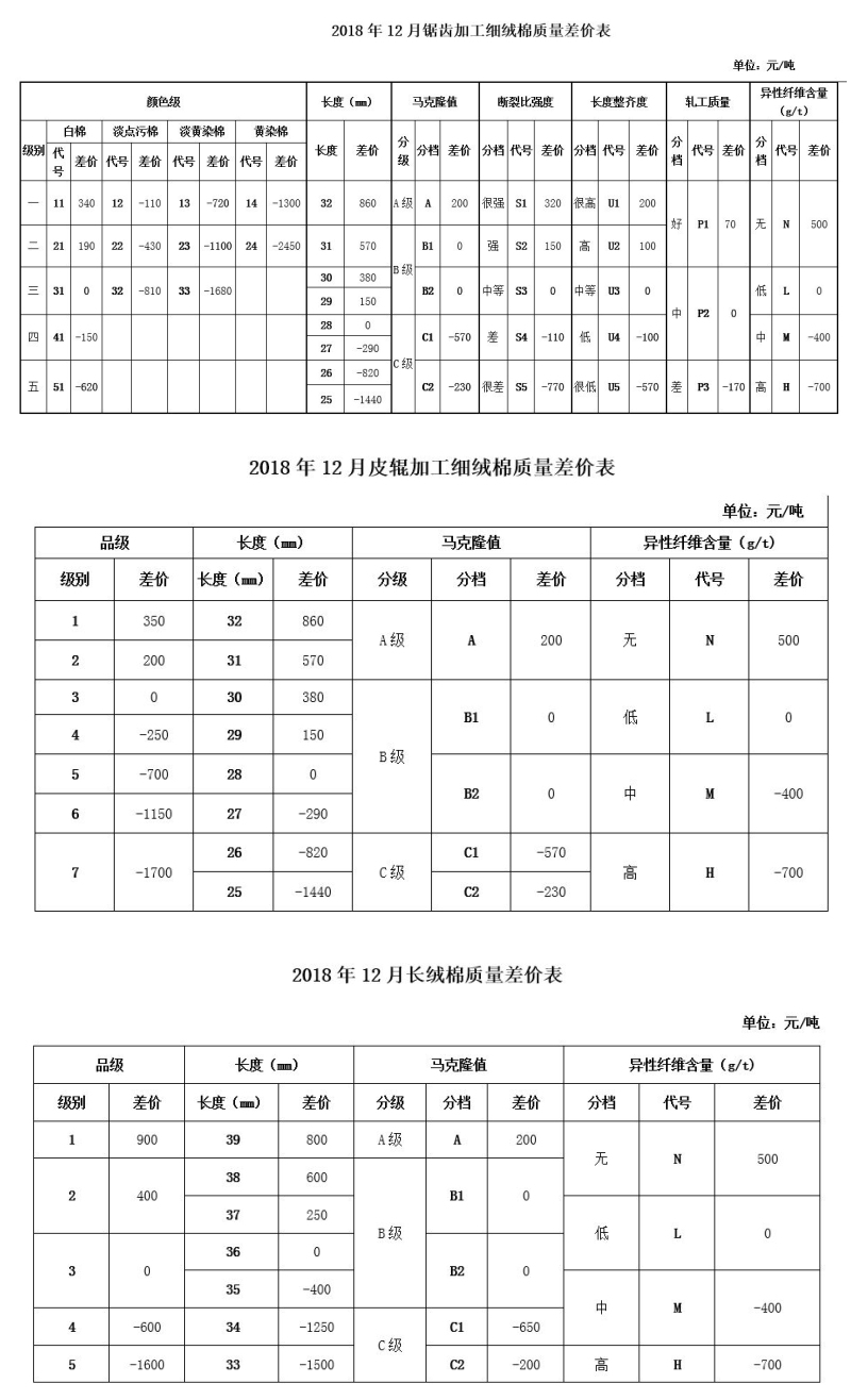 根據(jù)《中國棉花協(xié)會國產(chǎn)棉質(zhì)量差價表管理辦法》規(guī)定,現(xiàn)正式發(fā)布2018年12月《鋸齒加工細絨棉質(zhì)量差價表》、《皮輥加工細絨棉質(zhì)量差價表》和《長絨棉質(zhì)量差價表》(單位:元/噸)。