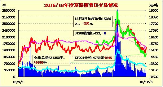 12月3日,隔夜鄭棉盤整,今日早盤受到中美兩國元首會晤的利好消息推動放量沖高,午后受到空頭賣盤壓制下滑,日線形成長上影線的陽線。日內(nèi)成交量放大,持倉量近減遠(yuǎn)增?;久媲闆r:信息員調(diào)查了解,安徽省不同規(guī)模紡織企業(yè)普遍反映,往年“金九銀十”行情在今年沒有出現(xiàn),十一月份是淡季特征明顯。突出地表現(xiàn)在純棉紗銷路不暢、下游拿貨不積極且價格陰跌。近期一些棉紡織廠純棉40支普梳價格已跌破24000元/噸,甚至低到23600元/噸。因此不少棉紡織廠棉紗庫存較上月上升,最多的達(dá)到了近一個月棉紗生產(chǎn)量。