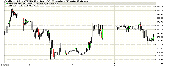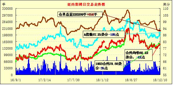 10日紐約期棉市場(chǎng)全面收跌。1903合約結(jié)算價(jià)79.88美分,跌35點(diǎn);1905合約結(jié)算價(jià)80.89美分,跌28點(diǎn);1907合約結(jié)算價(jià)81.46美分,跌27點(diǎn)。其他合約下跌27-40點(diǎn)不等。當(dāng)日3月合約小幅高開(kāi),開(kāi)盤(pán)后市場(chǎng)呈震蕩運(yùn)行態(tài)勢(shì),因缺乏有利支撐,交易重心下行,最終以小幅下跌收盤(pán)。美國(guó)農(nóng)業(yè)部12月份供需平衡表發(fā)布在即,市場(chǎng)普遍觀望此次月報(bào)中對(duì)產(chǎn)量、美棉出口量以及期末庫(kù)存等數(shù)據(jù)的調(diào)整。原定于當(dāng)?shù)貢r(shí)間周二進(jìn)行的英國(guó)脫歐協(xié)議投票推遲,英鎊急劇下滑,后市或?qū)⒃俣认滦?。同時(shí)受近期發(fā)生的突發(fā)事件影響,中美關(guān)系較為緊張,市場(chǎng)以觀望為主,整體避險(xiǎn)情緒較強(qiáng)。外圍美元指數(shù)上漲,大豆、玉米和小麥期貨下跌。美股周一收高,三大股指均漲勢(shì)收盤(pán)。