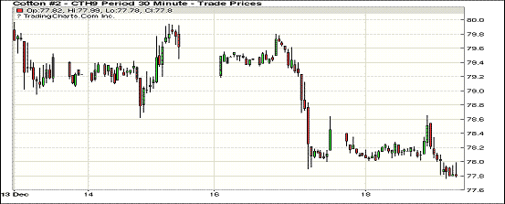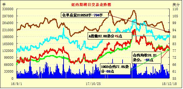 18日,美國股市反彈沒能拯救市場,油價(jià)再度重挫拖累使多數(shù)商品期貨走低,紐約期貨繼續(xù)向下突破,主力3月合約跌破78美分的心理支撐。美聯(lián)儲(chǔ)將于周三召開會(huì)議,無論是否決定加息都不會(huì)給市場帶來利好。當(dāng)日3月合約77.85美分,跌69點(diǎn),5月合約79.04美分,跌68點(diǎn),成交量21478手,較上個(gè)交易日增加5144手。截至12月17日收盤的持倉量為219252手,減少794手。