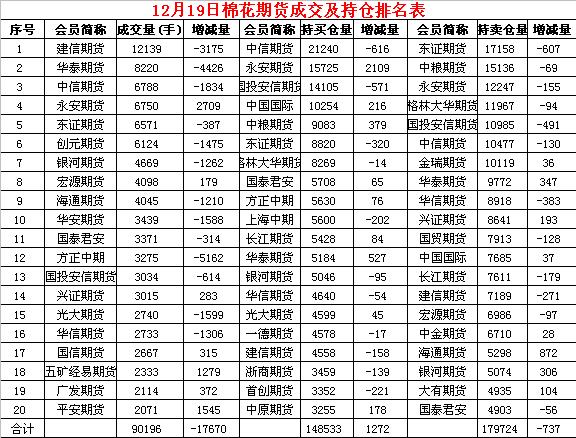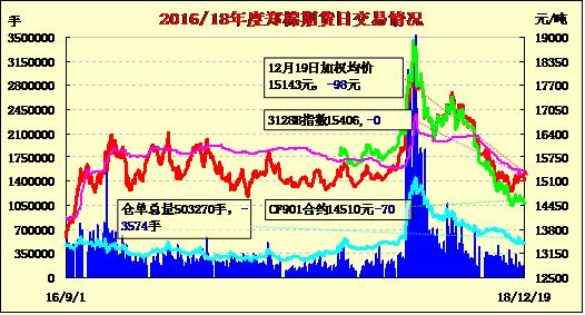 12月19日,隔夜鄭棉沖高回落,今日盤中低位震蕩,日線形成小陰線。日內(nèi)成交量萎縮,持倉量小幅增加?;久媲闆r:截至2018年12月18日,新疆棉花累計加工量423.9萬噸,同比減幅2.1%,其中,地方棉花加工量288.2萬噸,同比減幅1.0%,兵團棉花加工量135.7萬噸,同比減幅4.2%。當日加工量4.2萬噸。