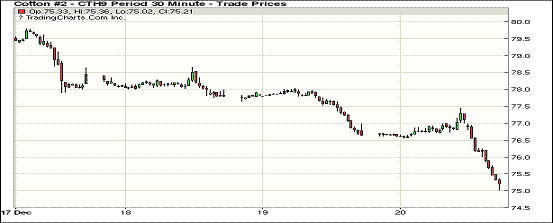 20日,盡管上周美棉出口簽約顯著增加,但中國依然沒有增加采購。當日,美國股市再遭血洗引發(fā)金融市場大幅震蕩,紐約棉花期貨在外部市場的重壓之下跌破前期低點并再創(chuàng)新低,市場成交暴增。美聯(lián)儲加息給市場以沉重的打擊,在中國恢復對美棉采購之前,市場將繼續(xù)承壓。當日3月合約75.06美分,跌165點,5月合約76.47美分,跌154點,成交量37767手,較上個交易日增加11437手。截至12月19日收盤的持倉量為216298手,減少945手。