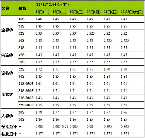 這周,全棉紗價(jià)格偏弱運(yùn)行,近期銷售不力,商家以出貨為主,相對32S高配、J21S走貨尚可,60S動(dòng)銷量略有放大,還有包覆紗32S全棉+40D氨綸較動(dòng)銷,主要用于錦棉彈力布生產(chǎn),全棉精梳銷售較顯一般。滌棉紗65/3580/2032S45S價(jià)格走勢均穩(wěn)定狀態(tài)。滌粘紗(65/35)32S/2需求抬升,主要用于生產(chǎn)TR條子導(dǎo)電布,滌粘紗價(jià)格走勢穩(wěn)中下調(diào)。純滌紗價(jià)格平穩(wěn)走勢,商家反映純滌紗45S銷量稍大些,目前滌綸短纖價(jià)格走勢略顯疲軟,中心價(jià)8950元/噸左右,預(yù)計(jì)下周純滌紗行情將有下行趨勢。部分人棉紗價(jià)格仍有下調(diào),10S銷量好于其他,粘膠短纖價(jià)格處于調(diào)整之中,均價(jià)13750元/噸左右,預(yù)計(jì)后市人棉紗將繼續(xù)呈調(diào)整態(tài)勢。