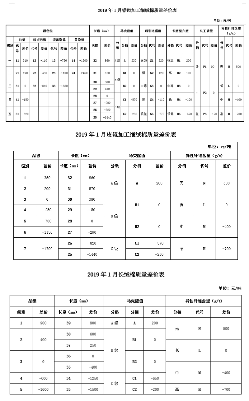 標題:2019年1月中棉協(xié)《國產(chǎn)棉質(zhì)量差價表》