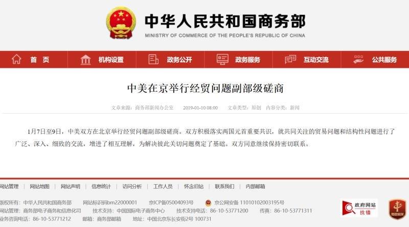 1月7-9日,中美雙方在北京舉行經(jīng)貿(mào)問題副部級(jí)磋商。雙方積極落實(shí)兩國元首重要共識(shí),就共同關(guān)注的貿(mào)易問題和結(jié)構(gòu)性問題進(jìn)行廣泛、深入、細(xì)致的交流,增進(jìn)相互理解,為解決彼此關(guān)切問題奠定基礎(chǔ)。雙方同意繼續(xù)保持密切聯(lián)系。