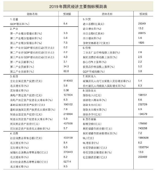 根據(jù)中國(guó)社會(huì)科學(xué)院中國(guó)宏觀經(jīng)濟(jì)季度模型預(yù)測(cè),2019年,我國(guó)GDP增長(zhǎng)率為6.4%,比上年略微減少0.2個(gè)百分點(diǎn)。從定性分析上看,這種預(yù)測(cè)結(jié)果與供給側(cè)和需求側(cè)兩方面的現(xiàn)實(shí)情況相一致。