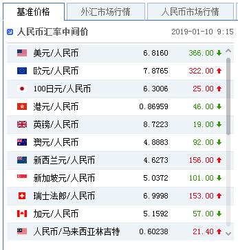 中國人民銀行授權中國外匯交易中心公布,2019年1月10日銀行間外匯市場人民幣匯率中間價為:1美元對人民幣6.8160元,1歐元對人民幣7.8765元,100日元對人民幣6.3006元,1港元對人民幣0.86959元,1英鎊對人民幣8.7223元,1澳大利亞元對人民幣4.8883元,1新西蘭元對人民幣4.6273元,1新加坡元對人民幣5.0372元,1瑞士法郎對人民幣6.9998元,1加拿大元對人民幣5.1592元,人民幣1元對0.60238馬來西亞林吉特,人民幣1元對9.7848俄羅斯盧布,人民幣1元對2.0314南非蘭特,人民幣1元對164.20韓元,人民幣1元對0.53896阿聯酋迪拉姆,人民幣1元對0.55043沙特里亞爾,人民幣1元對40.8164匈牙利福林,人民幣1元對0.54644波蘭茲羅提,人民幣1元對0.9484丹麥克朗,人民幣1元對1.3003瑞典克朗,人民幣1元對1.2420挪威克朗,人民幣1元對0.80412土耳其里拉,人民幣1元對2.8203墨西哥比索,人民幣1元對4.6858泰銖。