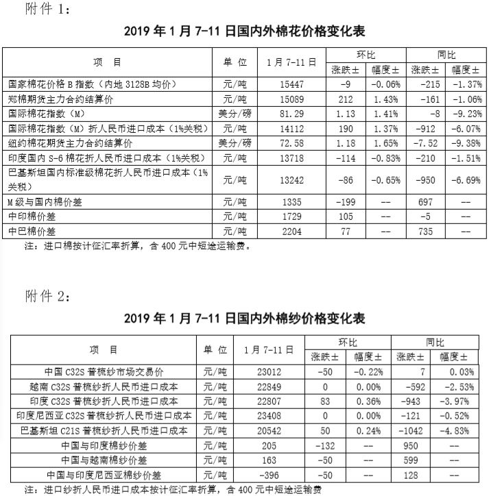 附件1:2019年1月7-11日國內(nèi)外棉花價格變化表