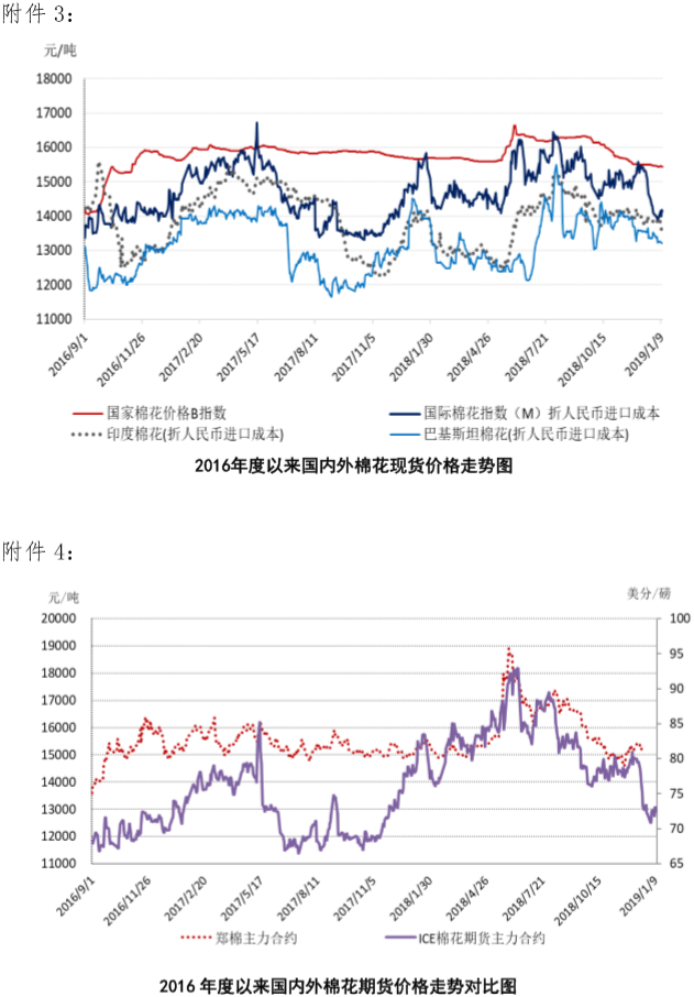 本周,在中美貿(mào)易磋商和美元指數(shù)下跌影響下,國際棉價上漲。2019年1月7-11日,紐約棉花期貨主力合約結算價72.58美分/磅,較上周上漲1.18美分/磅,漲幅1.65%;代表進口棉中國主港到岸均價的國際棉花指數(shù)(M)為81.29美分/磅,較上周上漲1.13美分/磅,漲幅1.41%,折人民幣進口成本14112元/噸,較上周上漲190元/噸,漲幅1.37%;內(nèi)外棉價差1335/噸,較上周縮小199元/噸。(詳見附件1)