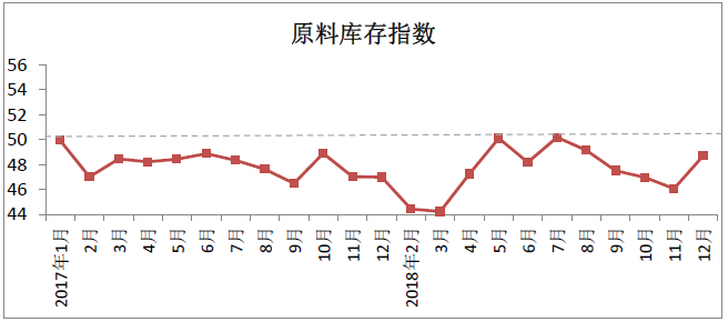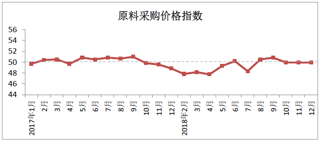 12月原料采購價格指數(shù)49.92,與11月相比下降0.02。12月初,中美貿(mào)易摩擦取得階段性共識,期貨市場風險偏好回升,國內(nèi)外棉花期貨順勢而為,迅速反彈,帶動棉花現(xiàn)貨價格小幅回升,但在市場需求疲軟及中美貿(mào)易摩擦最終走向不明朗的背景下,棉花現(xiàn)貨價格在短暫的回升后又開始下跌?;w短纖價格繼續(xù)延續(xù)下跌趨勢,但跌勢放緩。12月,CotlookA指數(shù)平均值86美分/磅,環(huán)比下降0.78美分/磅;國內(nèi)3128B級棉花現(xiàn)貨均價為15026元/噸,環(huán)比下降46元/噸;主流粘膠纖維均價為13777元/噸,環(huán)比下降393元/噸;1.4D直紡滌短均價為8909元/噸,環(huán)比下降219元/噸。近期,在中美雙方貿(mào)易磋商消息的帶動下,市場信心稍有恢復,棉花價格止跌反彈,但棉花市場供應壓力仍有待釋放,加上年底放假,因此價格上漲幅度不會太大。