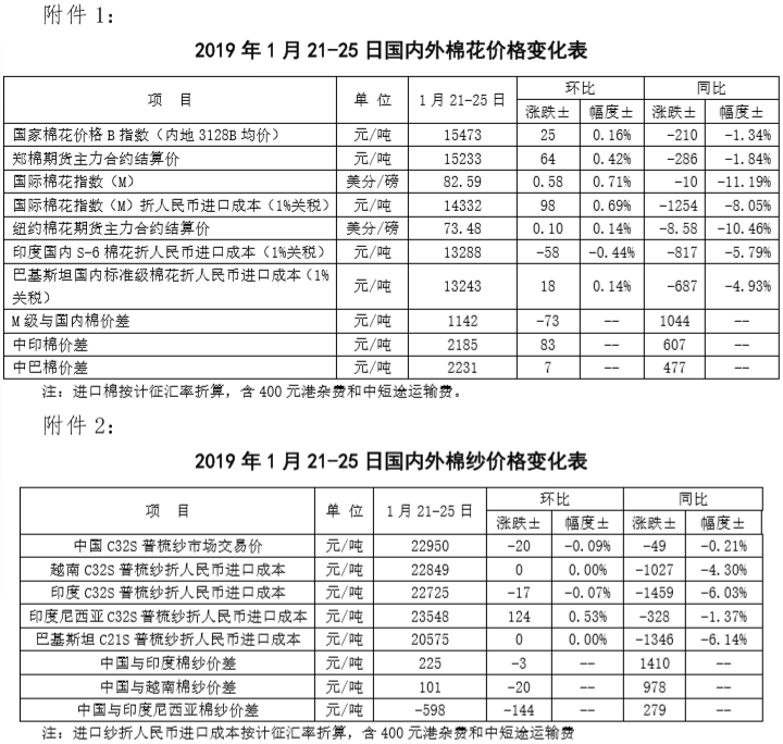 附件1:2019年1月21-25日國(guó)內(nèi)外棉花價(jià)格變化表