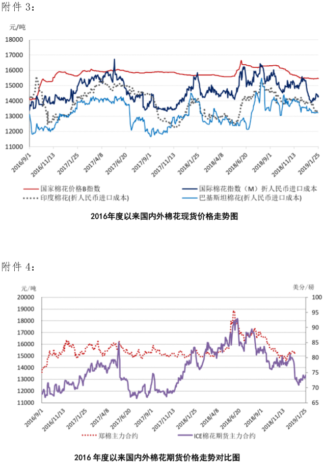 本周,美元指數(shù)下跌,刺激商品市場(chǎng)上漲,國(guó)際棉價(jià)整體跟漲。2019年1月21-25日,紐約棉花期貨主力合約結(jié)算價(jià)73.48美分/磅,較上周上漲0.1美分/磅,漲幅0.14%;代表進(jìn)口棉中國(guó)主港到岸均價(jià)的國(guó)際棉花指數(shù)(M)為82.59美分/磅,較上周上漲0.58美分/磅,漲幅0.71%,折人民幣進(jìn)口成本14332元/噸,較上周上漲98元/噸,漲幅0.69%;內(nèi)外棉價(jià)差1142元/噸,較上周縮小73元/噸。(詳見(jiàn)附件1)