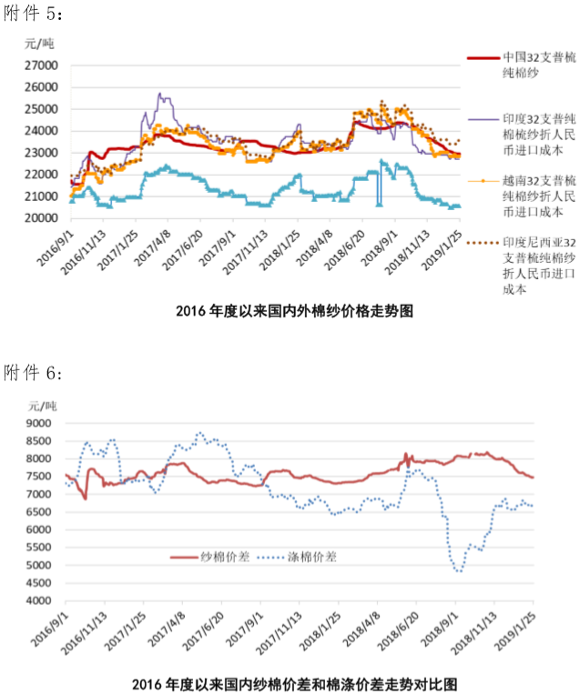 附件5:2016年度以來(lái)國(guó)內(nèi)外棉紗價(jià)格走勢(shì)圖