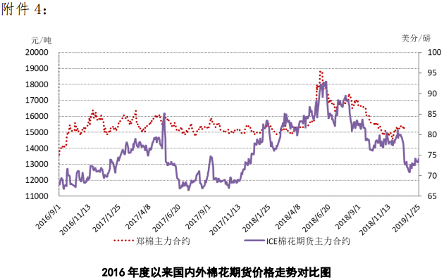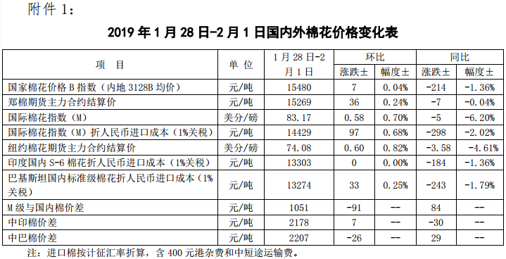 附件1:2019年1月28日-2月1日國內外棉花價格變化表