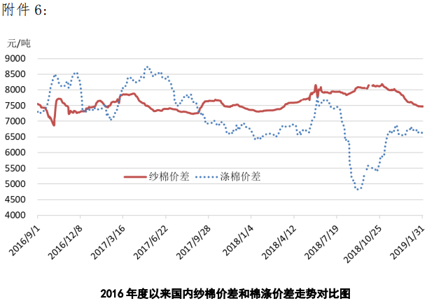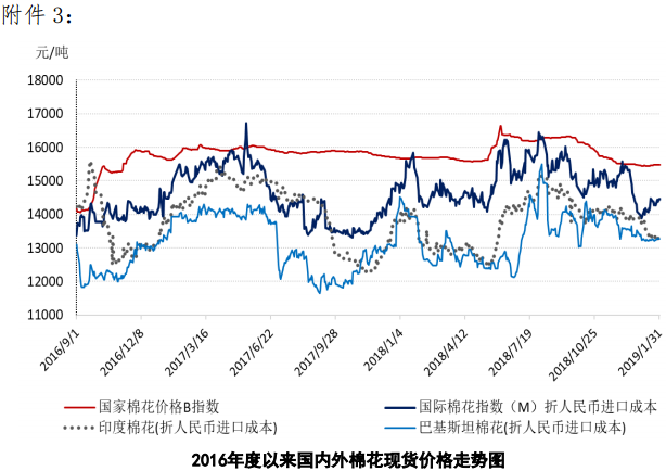本周,受美國政府重新開門、美聯(lián)儲未加息提振,美股上漲,國際棉價跟漲。2019年1月28日-2月1日,紐約棉花期貨主力合約結算價74.08美分/磅,較上周上漲0.6美分/磅,漲幅0.82%,代表進口棉中國主港到岸均價的國際棉花指數(shù)(M)為83.17美分/磅,較上周上漲0.58美分/磅,漲幅0.7%,折人民幣進口成本14429元/噸,較上周上漲97元/噸,漲幅0.68%;內外棉價差1051元/噸,較上周縮小91元/噸。(詳見附件1)