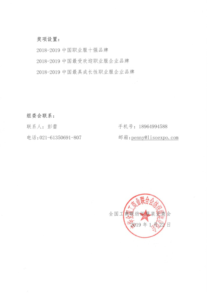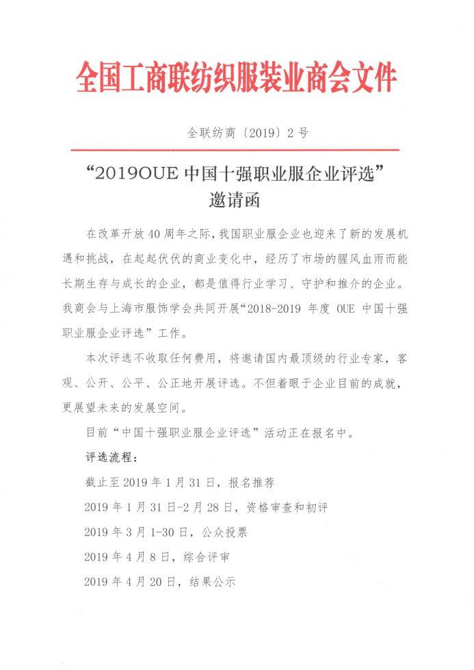 5.結(jié)果公示:主辦方將于2019年4月20日在OUE中國(guó)十強(qiáng)職業(yè)服企業(yè)評(píng)選頒獎(jiǎng)晚宴進(jìn)行頒獎(jiǎng)。