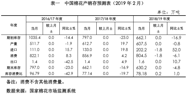 據(jù)國(guó)家棉花市場(chǎng)監(jiān)測(cè)系統(tǒng)預(yù)測(cè),2018/19年度棉花產(chǎn)量607.5萬噸,紡織用棉消費(fèi)量806.3萬噸,加上其他用棉約36萬噸。截至2019年2月1日,國(guó)內(nèi)累計(jì)銷售皮棉230萬噸,尚未銷售的新棉仍有378萬噸,在不考慮棉花進(jìn)口的情況下,可滿足5個(gè)月以上的消費(fèi)需求。