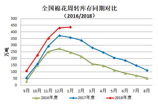 1月,紡織用棉企業(yè)為春節(jié)備貨補充庫存,市場成交較上期有所活躍,同時新棉收購加工進入尾聲,入市量明顯下降,月末全國棉花周轉(zhuǎn)庫存小幅增加,但增幅大幅減緩。據(jù)中國棉花協(xié)會棉花物流分會對全國18個省市的186家棉花交割和監(jiān)管倉庫的調(diào)查數(shù)據(jù)顯示:1月底,全國棉花周轉(zhuǎn)庫存總量約436.35萬噸,較上月增加4.8萬噸,增幅1.1%;增幅環(huán)比下降21.1%。