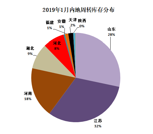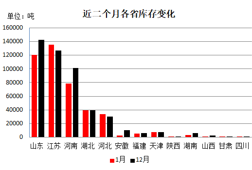 從各省庫存分布情況看:江蘇省庫存量最大為13.57萬噸;山東省次之為12.08萬噸;河南省居第三位為7.82萬噸;此外湖北省3.97萬噸,河北省3.34萬噸,其他省在萬噸以下。