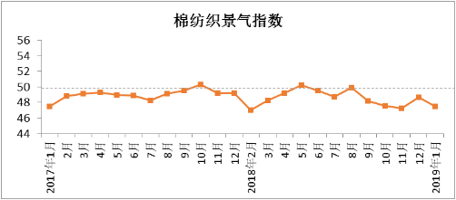 2019年1月中國棉紡織景氣指數(shù)47.5,與去年12月相比下降1.17。1月年關(guān)將至,絕大多數(shù)下游企業(yè)基本完成備貨,生產(chǎn)逐步進(jìn)入放假模式。產(chǎn)品庫存增加已是不爭的事實,企業(yè)壓力不言而喻,行業(yè)景氣度略顯低迷,但也屬于正?,F(xiàn)象。近期中美貿(mào)易磋商持續(xù)進(jìn)行,目前來看,雙方商談有利好勢頭,增加企業(yè)家市場信心。新年伊始,產(chǎn)品競爭力好的紡織企業(yè)陸續(xù)開工,市場交投尚未完全恢復(fù),招工難成為企業(yè)較關(guān)注的事情。隨著節(jié)日氣氛逐漸褪去,生產(chǎn)、銷售逐步回歸正規(guī),預(yù)計2月中國棉紡織景氣指數(shù)有所回升。