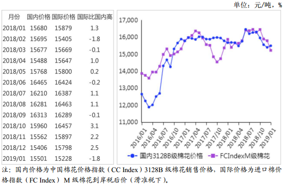 (一)國(guó)內(nèi)棉花價(jià)格小幅回升。1月紡織企業(yè)棉花庫(kù)存逐漸消化,對(duì)新棉需求增加,國(guó)內(nèi)棉花價(jià)格出現(xiàn)企穩(wěn)回升態(tài)勢(shì)。但由于臨近春節(jié),紡織企業(yè)生產(chǎn)經(jīng)營(yíng)放緩,采購(gòu)新棉積極性不高。另外從外圍整體環(huán)境看,由于中美經(jīng)貿(mào)談判尚未結(jié)束,盡管市場(chǎng)主體抱有很大期望,但結(jié)果還存在一定不確定性,影響整體市場(chǎng)信心,導(dǎo)致新棉銷(xiāo)售進(jìn)度仍緩慢。1月國(guó)內(nèi)3128B級(jí)棉花月均價(jià)每噸15501元,環(huán)比漲0.6%,同比跌1.1%。鄭棉期貨主力合約1905月結(jié)算價(jià)每噸15280元,環(huán)比漲3.0%,同比漲0.5%。