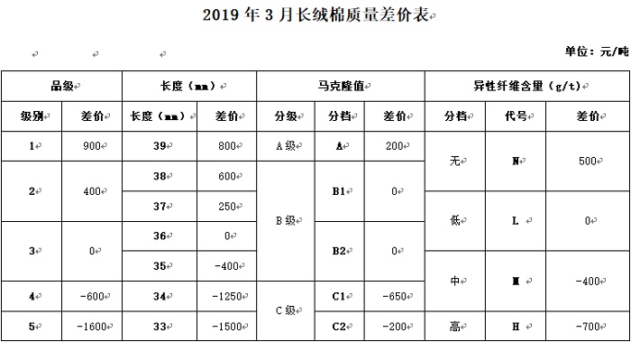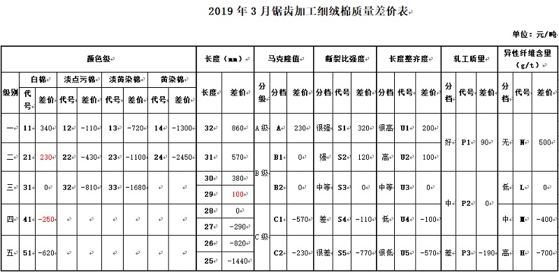 依據(jù)2019年2月的棉花公檢質(zhì)量數(shù)據(jù)、中國棉花協(xié)會棉花質(zhì)量價差自動生成系統(tǒng)采集的棉花加工企業(yè)銷售成交價、紡織企業(yè)監(jiān)測點的采集數(shù)據(jù)以及當月的中國棉花價格指數(shù),2019年3月鋸齒加工細絨棉質(zhì)0量差價調(diào)整數(shù)據(jù)據(jù)此生成,并征求行業(yè)內(nèi)有關(guān)專家的意見,現(xiàn)對《鋸齒加工細絨棉質(zhì)量差價表》做出如下調(diào)整(單位:元/噸):