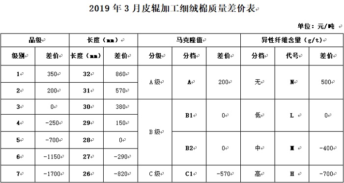 根據(jù)《中國棉花協(xié)會國產(chǎn)棉質(zhì)量差價表管理辦法》規(guī)定,現(xiàn)正式發(fā)布2019年3月《鋸齒加工細絨棉質(zhì)量差價表》、《皮輥加工細絨棉質(zhì)量差價表》和《長絨棉質(zhì)量差價表》(單位:元/噸)。