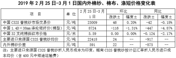 附件2:2019年2月25日-3月1日國內(nèi)外棉紗價格變化表