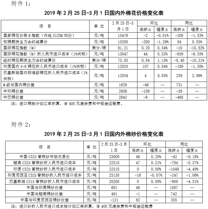 附件1:2019年2月25日-3月1日國內(nèi)外棉花價格變化表